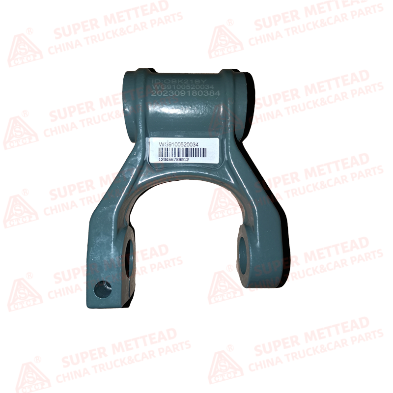 This balance shaft bracket is a precision-cast ductile iron component, featuring a robust U-shaped design optimized for heavy-duty truck chassis integration. The main body is a rib-reinforced casting, with a central cylindrical bore for balance shaft mounting and two side mounting lugs with precision-machined holes for chassis attachment. The entire assembly is finished with a matte gray anti-corrosion coating, and a label with the part number “WG9100520034” is affixed for easy identification.