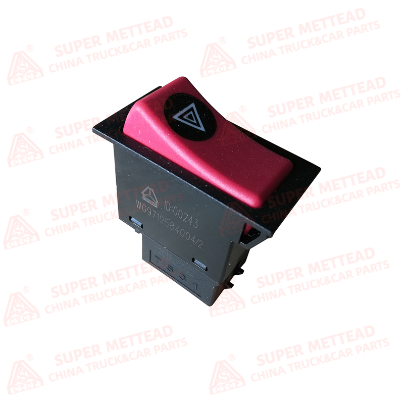 This Emergency Switch WG9719584004 is an OEM safety control component for Sinotruk heavy-duty trucks (e.g., HOWO 371, 336, T5G, A7). It features a rugged black ABS rocker switch housing with a red emergency warning icon, precision internal copper contact terminals, and a plug-in PCB base with factory-etched part identification. Designed for flush installation in the truck’s instrument panel, it adheres to strict OEM standards for electrical stability and mechanical durability, ensuring reliable operation in high-vibration, temperature-fluctuating cab environments.