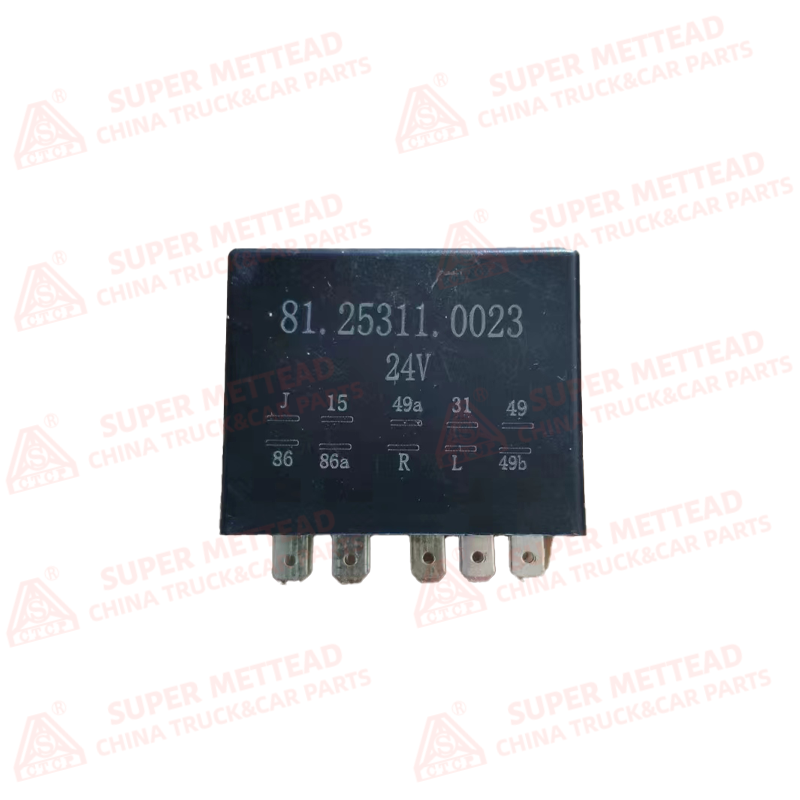 This Flash Relay Alarm 81.25311.0023 is an OEM electrical control component specifically designed for heavy-duty commercial vehicles (e.g., MAN series trucks). Rated at 24V DC, it features a rugged black epoxy-sealed housing with precision-pin electrical terminals clearly marked with industry-standard codes (J, 86, 15, 86a, 49a, etc.). Engineered for high current handling and anti-interference performance, it serves as the core control unit for the vehicle’s turn signal and hazard warning light systems. Manufactured to strict OEM tolerances, it ensures stable signal switching and perfect compatibility with the vehicle’s original electrical architecture.