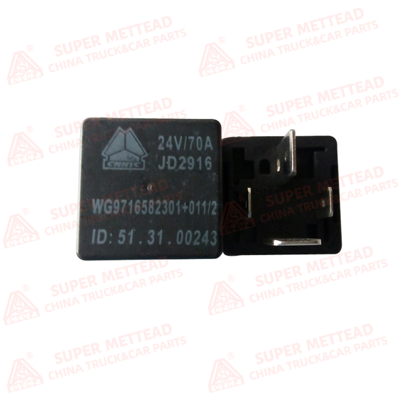 This JD2916 Relay 24V70A WG9716582301-011 is an OEM electrical control component for Sinotruk heavyduty trucks (HOWO 371, 336, T5G, A7, etc.). It features a rugged housing with highconductivity terminals, designed for heavyduty highcurrent circuit control. It meets strict OEM standards for stability, vibration resistance, and long service life under harsh working conditions.
