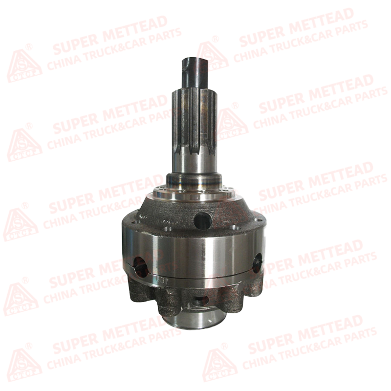 This middle axle differential assembly is a heavy-duty, fully integrated unit designed for multi-axle heavy-duty trucks. It is constructed from high-strength alloy steel and ductile cast iron, featuring precision-forged gears, a robust differential case, and integrated splined input/output shafts. The assembly includes all necessary internal components: differential side gears, pinion gears, cross shaft, and pre-adjusted bearings, eliminating the need for complex on-site assembly. The gear teeth are precision-cut and carburized for exceptional wear resistance, while the case is engineered to withstand the high torque loads and dynamic stresses of multi-axle operation. Precision-machined mounting surfaces and oil passages ensure proper lubrication and alignment, making it suitable for the demanding conditions of long-haul and heavy-load transportation.