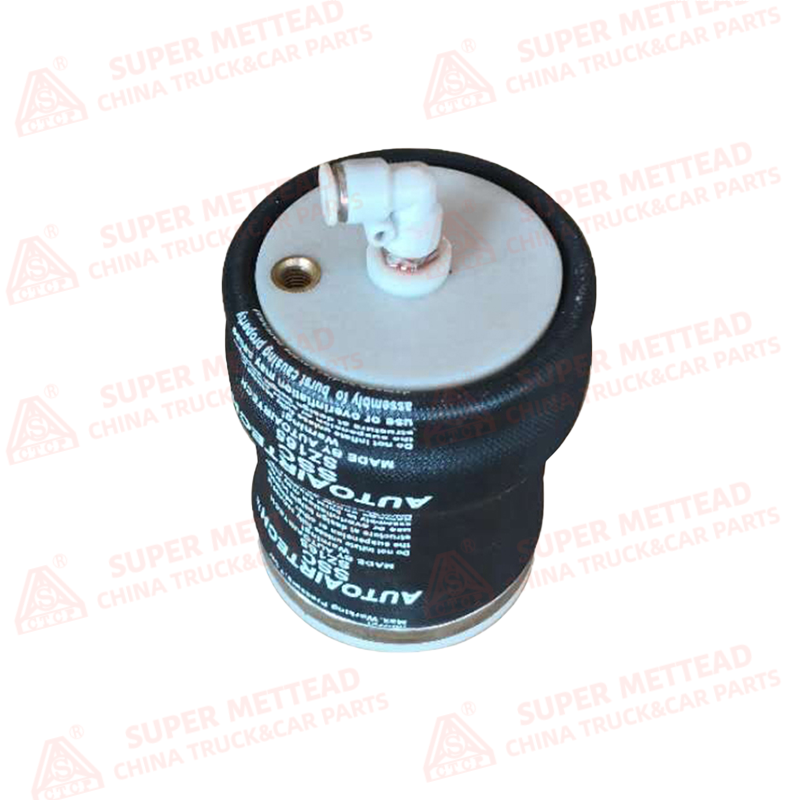 Structure: A robust, inflatable air spring made of reinforced, wear-resistant rubber with a fabric outer layer. It features a metal top plate with an air inlet fitting and a mounting point for secure installation.