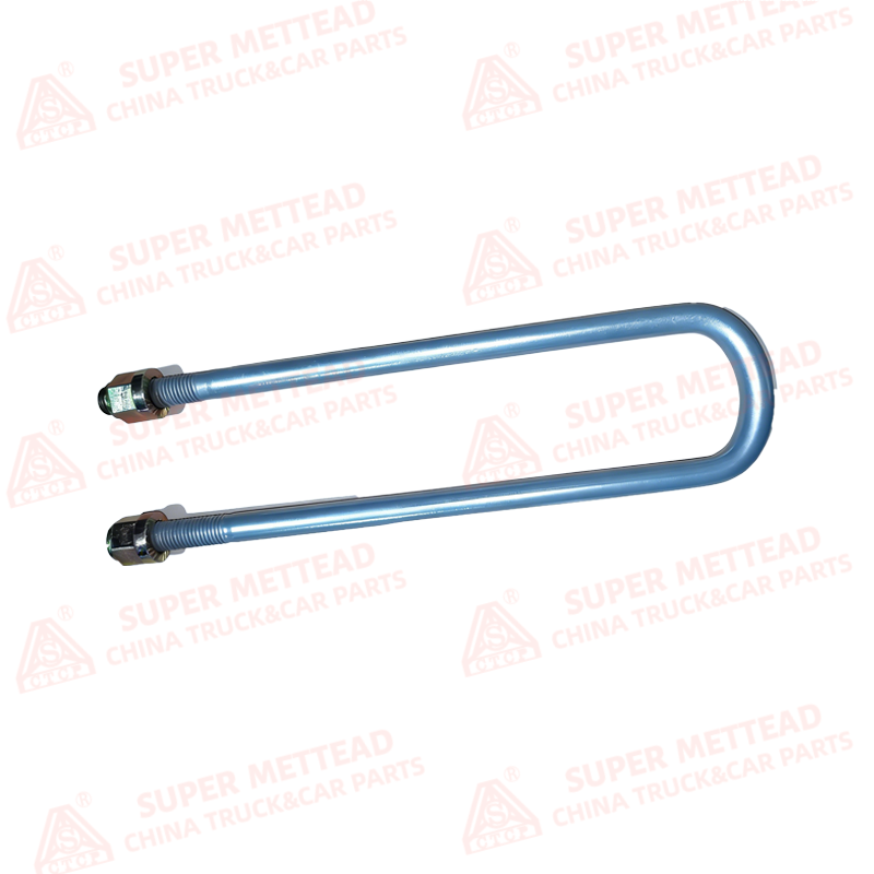 This U-bolt is a heavy-duty fastening component designed for heavy-duty truck suspension systems. It features a U-shaped, high-strength steel bolt with a blue anti-corrosion coating, paired with two precision-threaded hexagonal nuts. The robust design ensures secure clamping of suspension components under extreme loads and harsh operating conditions.