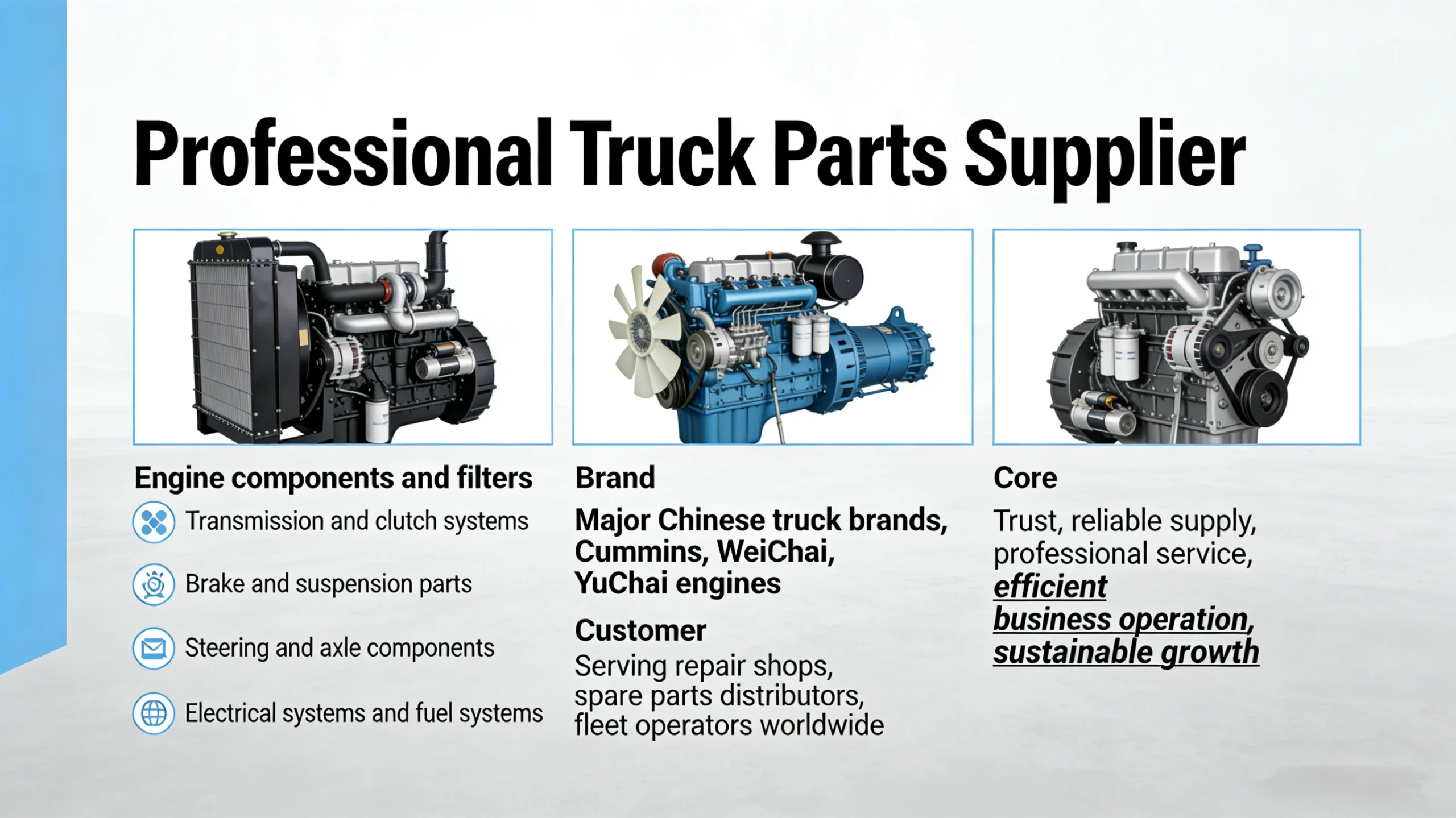 We provide engines from Cummins, WeiChai, and YuChai in addition to parts for major Chinese truck brands.