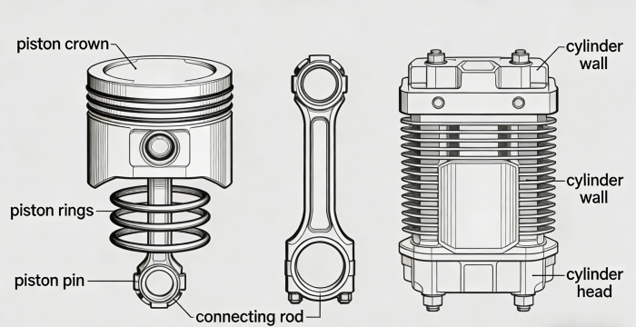 Wear and scuffing are common failures, caused by insufficient lubrication, poor fuel quality, or engine overheating. Scuffing occurs when the piston surface rubs directly against the cylinder wall, damaging both components.